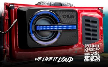 The DS18 BRO-BASS is a custom-fit, 6th-generation (2021+) Ford Bronco tailgate subwoofer enclosure. It features a loaded 12-inch shallow sub (IXS12.4D), delivering 800W RMS/1600W Max power. The IPX1-rated, ported enclosure includes RGB LED lighting and is designed to save cargo space.
