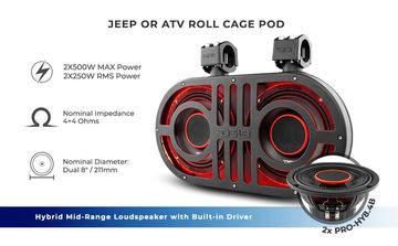DS18 Jeep Soundbars are high-density, UV-protected plastic overhead soundbars designed for most Jeep Models and are designed to upgrade audio with four 8-inch speakers, four 3.72-inch tweeters, and two compression drivers. It features pre-wired harnesses for easy, bolt-on installation, RGB LED lighting, and an OEM fit.